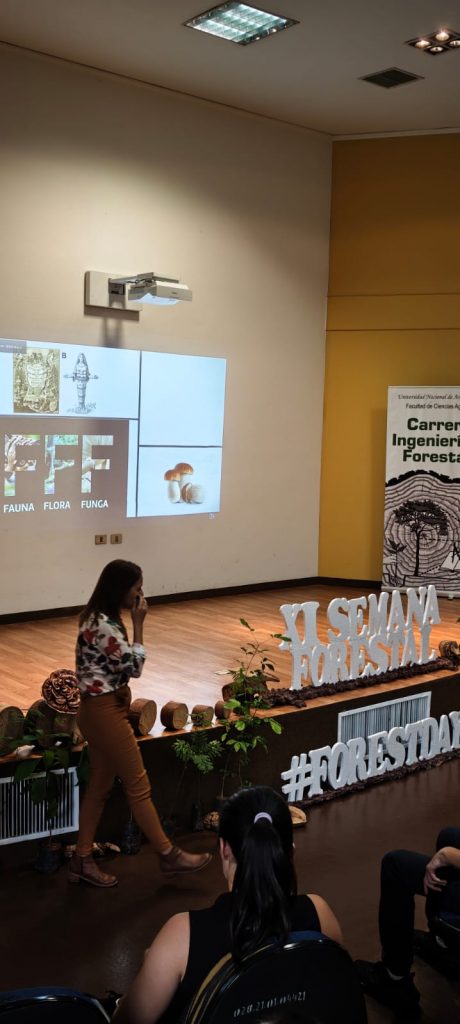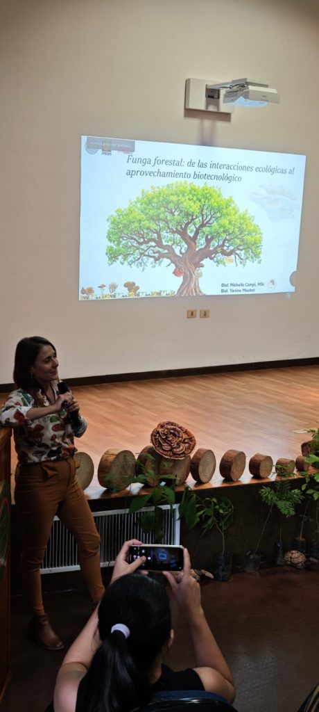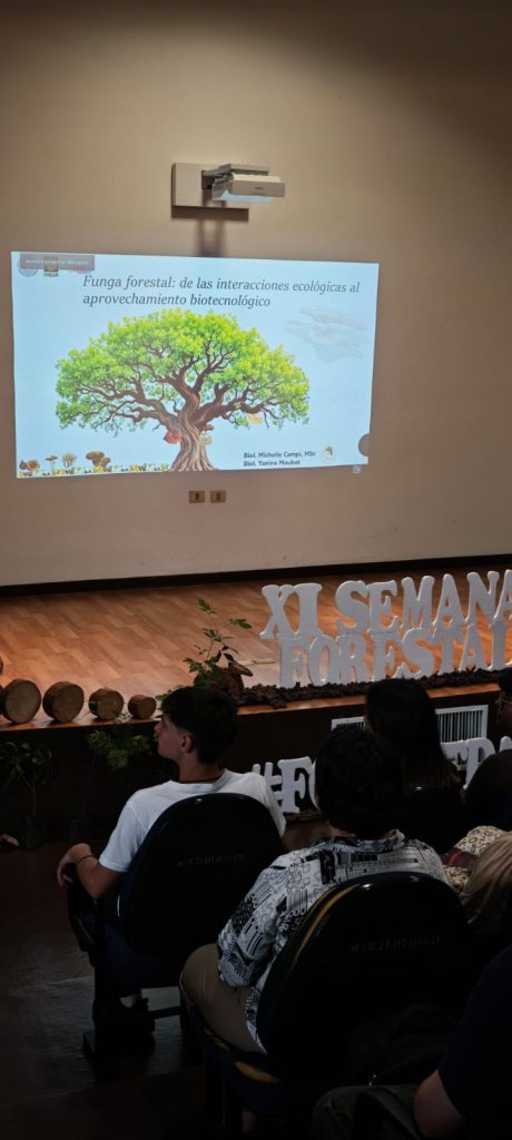 Posteriormente, se realizó la ponencia “Funga forestal: de las interacciones ecológicas al aprovechamiento biotecnológico”, presentada por las biólogas Michelle Campi y Yanine Maubet. Esta actividad se desarrolló de 13:00 a 14:00 h en el salón auditorio de la biblioteca, abordando el rol ecológico de los hongos forestales y sus potenciales aplicaciones en el ámbito biotecnológico.